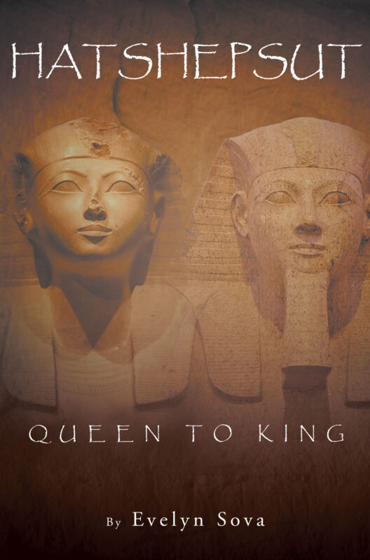 ᅠHATSHEPSUT, QUEEN TO KING, is a historical novel, geared to adult readers, telling the story of a remarkable woman who ruled Egypt about 1500 years before the more well known Cleopatra, and was, by most accounts. considered to be the greatest female ruler in history. Hatshepsut's "peaceful" reign was in Egypt's 18th Dynasty. She opened trade routes with other countries, re-opened the Sinai mines for gold, and vigorously promoted Egypt's agriculture and the arts, particularly architecture. To better relate to her people, who were not used to a female ruler, she frequently appeared in male pharaoh robes and a fake beard. But despite her "peacetime" reign, Hatshepsut's personal life was anything but. Being a female ruler, she had many political enemies. Her husband, Thutmose II, and later her nephew. Thutmose III, were war hungry men. Her chief architect, Senmut, was rumored to be more than just the chief architect. After her death, her enemies tried to erase her name from history, by destroying all the monuments she had built that has her image and/or name inscribed on. Her mummy was stolen and has never been definitively found. Fortunately, her enemies failed to erase her from history, and Hatshepsut lives here, in Evelyn Sova's exciting interpretation.